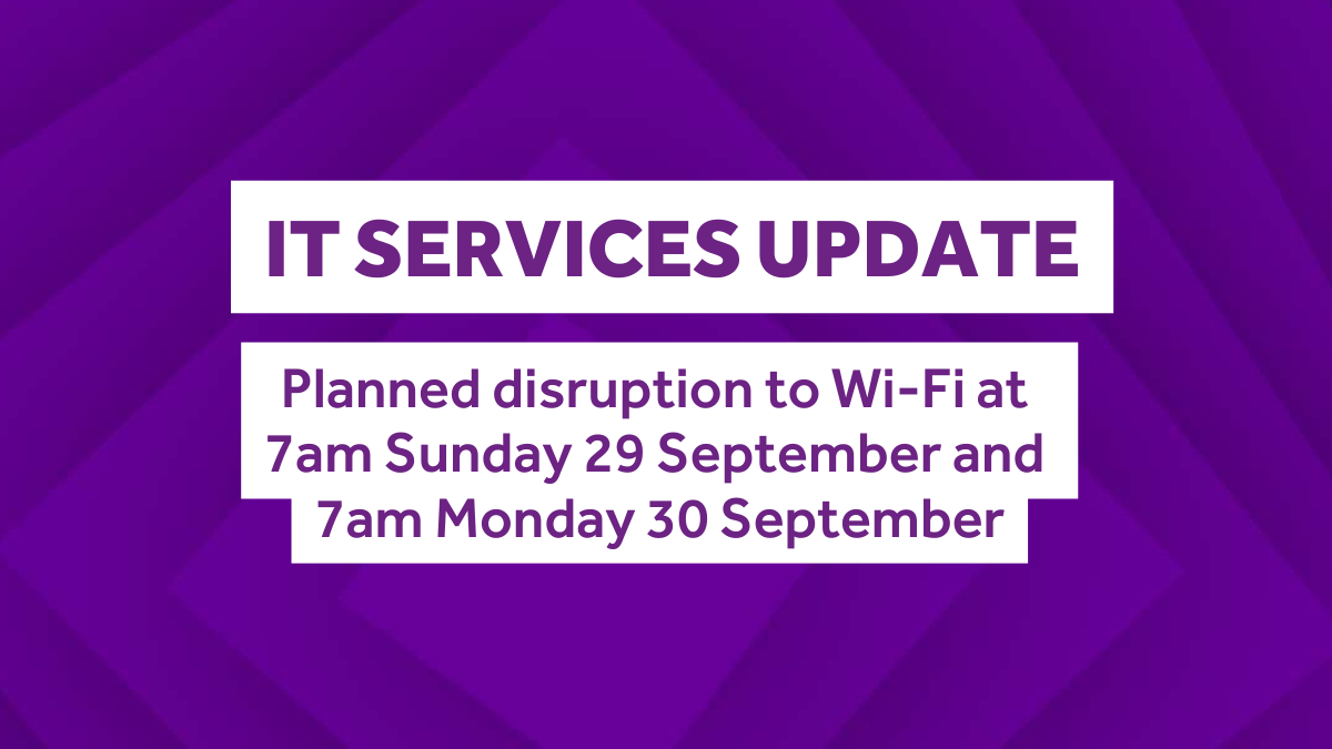 Between 7am on Sunday 29 September and 7am on Monday 30 September, Wi-Fi connectivity will be temporarily lost or disrupted for approximately 10 minutes while this work takes place. Different areas will be affected at different times, however due to the nature of the work, it is not possible to state at exactly which time each area will be affected.