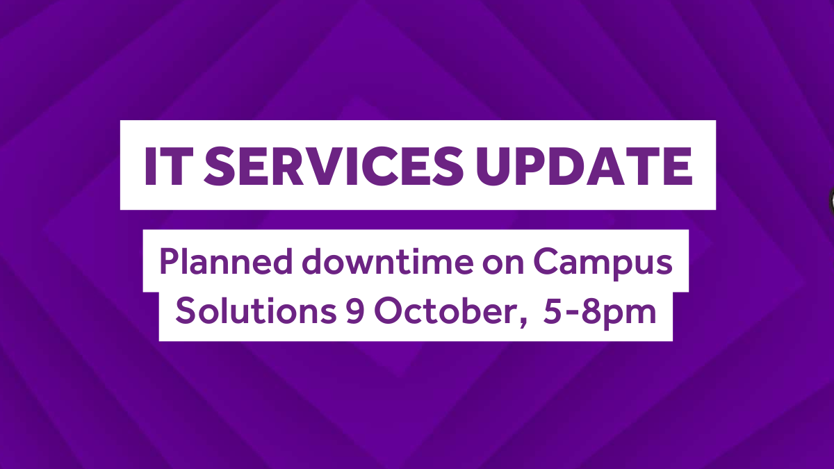 On Wednesday 9 October, IT Services are performing maintenance which will affect Campus Solutions from 5pm to 8pm. During this time, you may experience disruption.