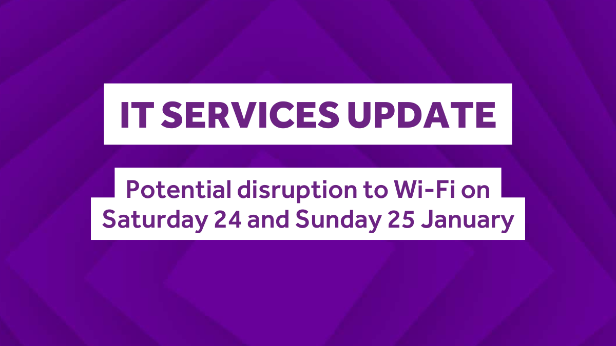 Essential maintenance is needed on the University’s Wi-Fi service, and this may result in degradation or loss of Wi-Fi access in some areas on campus and in halls of residence, for a few minutes.